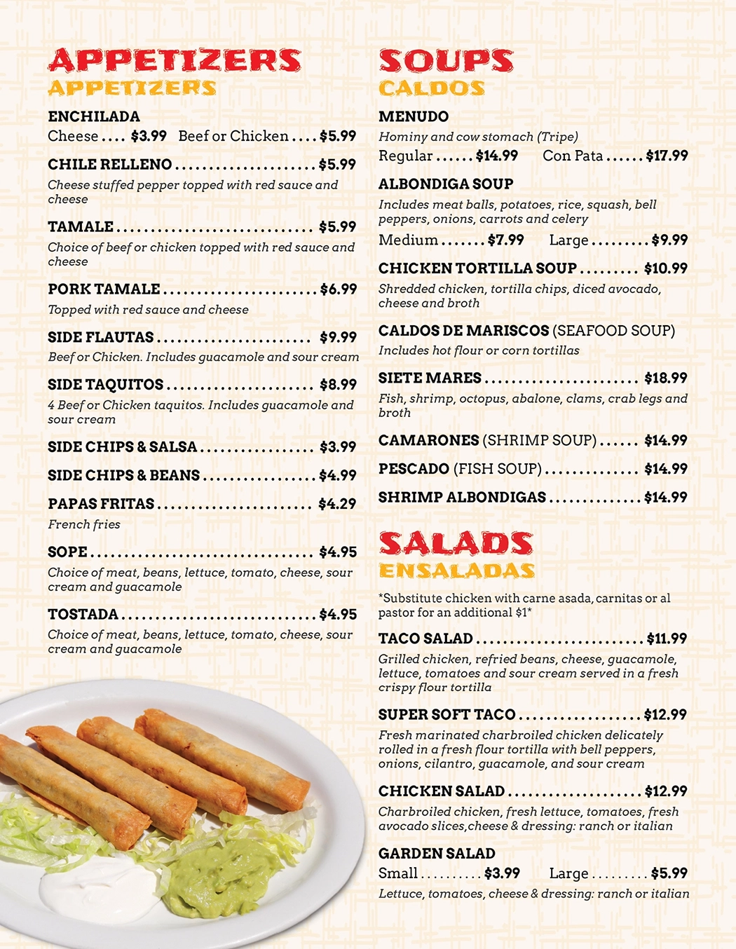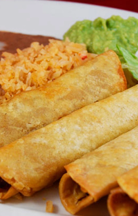 4 Beef or Chicken taquitos. Includes guacamole and sour cream.