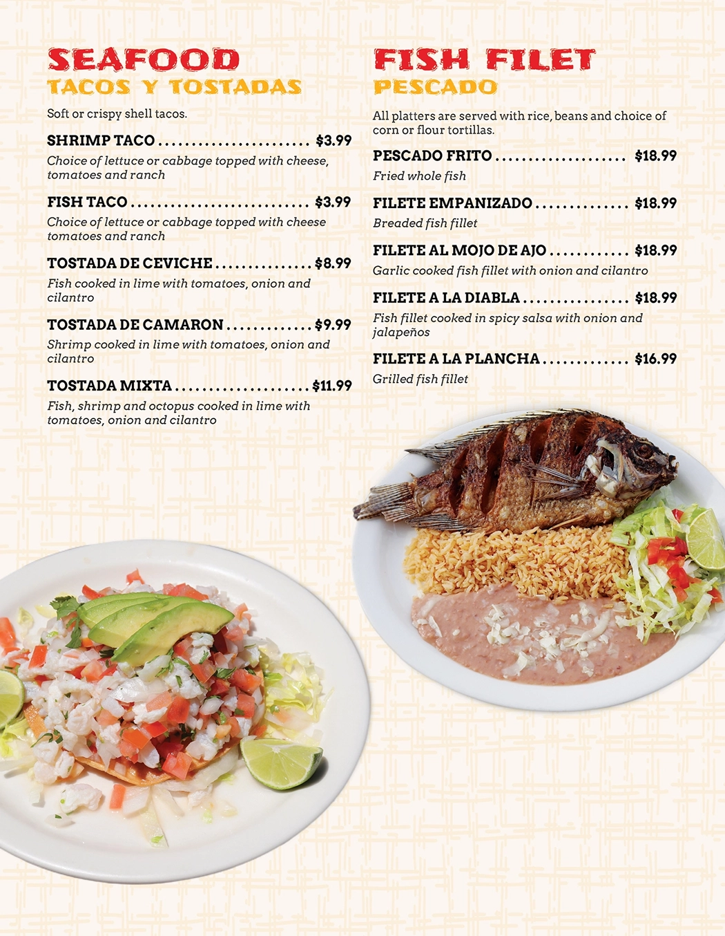 Large breaded steak or chicken ($17.99) fried to perfection with choice of flour or corn tortillas